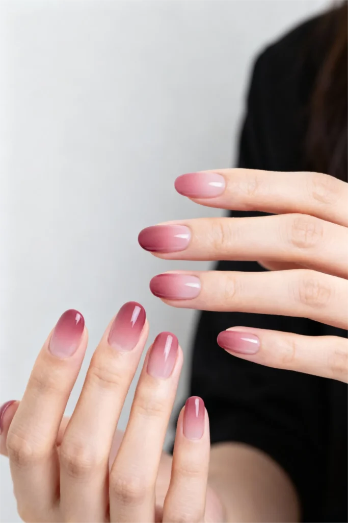 Ombré nails are classic for a reason—they’re pretty, they’re subtle, and they work on everyone. This version features a soft gradient from a deeper mauve-pink at the cuticle to a lighter, almost peachy-pink at the tips. The transition is seamless and soft, creating this really elegant, feminine look that’s not too sweet or juvenile.