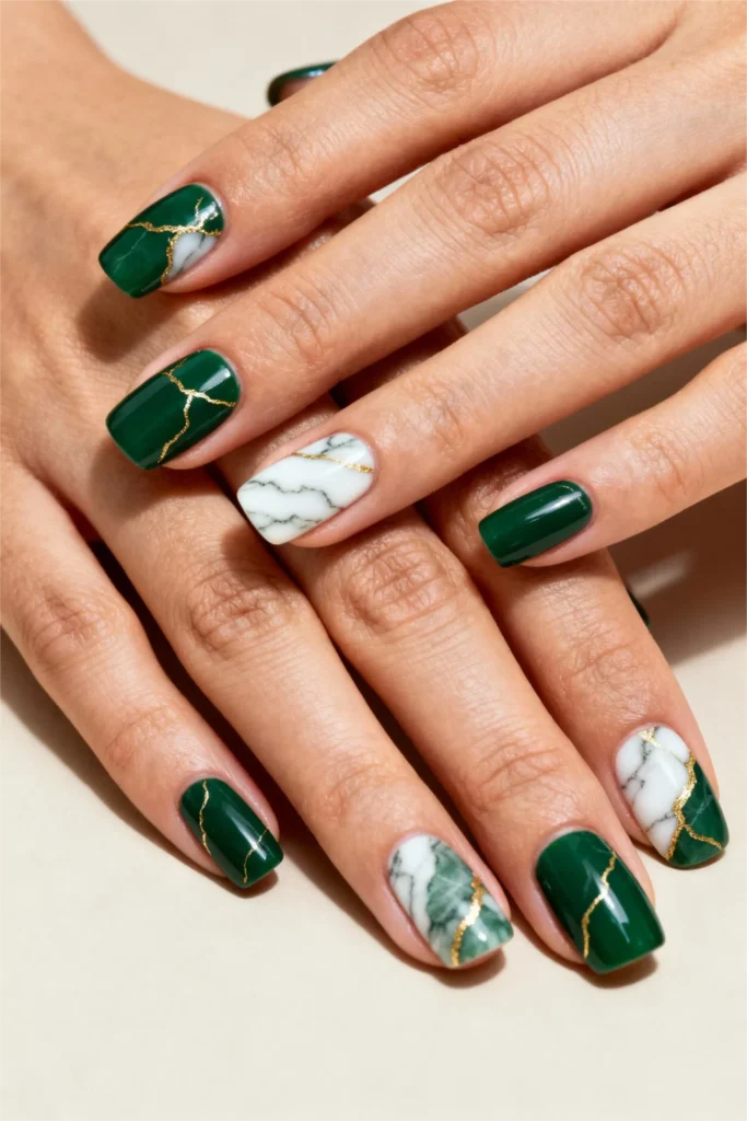 Okay, this one’s fancy. Rich emerald green paired with white marble accent nails featuring gold veining—it’s luxe, it’s dramatic, it’s giving expensive jewelry vibes. The emerald is deep and saturated with a beautiful glossy finish that makes it look like actual gemstones. Then those marble nails with gold veins add texture and visual interest without overwhelming the design.
