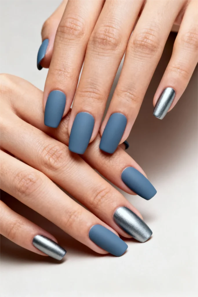 But here’s where it gets interesting: a couple of the nails have this metallic silver chrome finish. Not glitter, not sparkle—chrome. It’s reflective and futuristic, like liquid metal. The contrast between the soft matte blue and the shiny chrome creates this really dynamic look that’s way more interesting than just solid color nails. It’s a subtle way to add dimension and personality without going overboard.