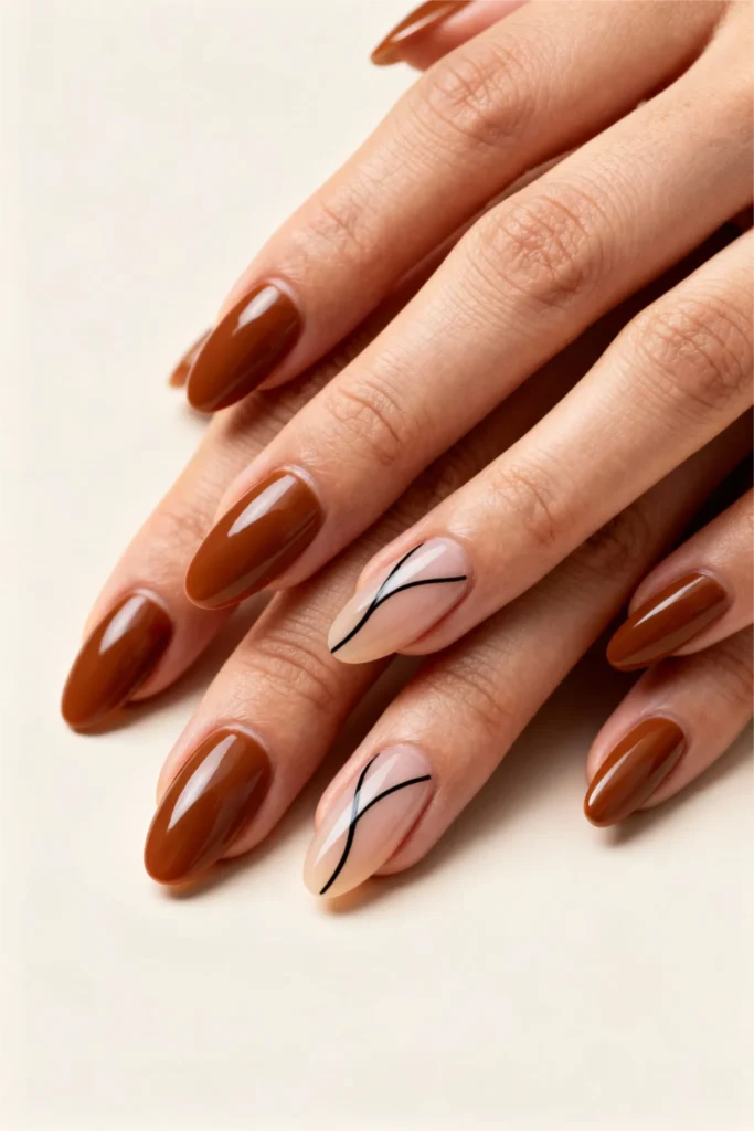 Okay, this one’s for the girls who like a little something extra but don’t want to go full maximalist. The base is this gorgeous warm caramel—think somewhere between tan and light brown—and then there are these delicate black line details on a couple of accent nails. It’s minimal but intentional. The kind of design that makes people lean in a little closer and say, “wait, I love your nails.”