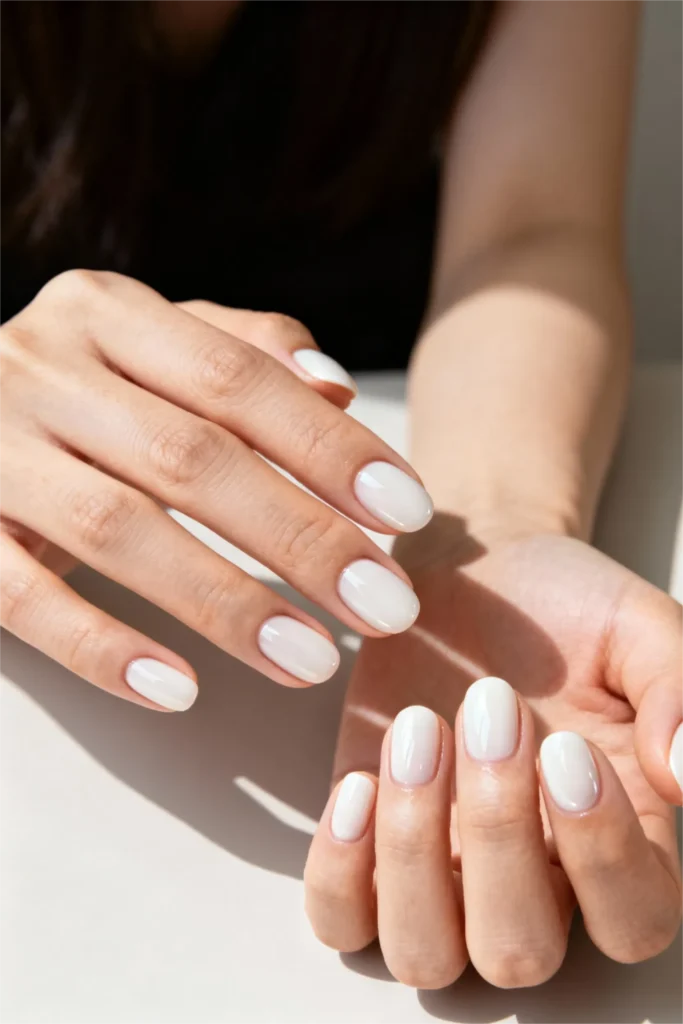 Let’s end with a classic because sometimes simple is exactly what you need. These short, white glossy nails are clean, fresh, and endlessly versatile. The oval shape is soft and natural-looking, and the high-gloss finish makes them look polished and intentional rather than plain or boring. White nails have this minimalist elegance that never goes out of style.