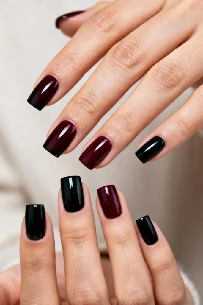 What makes this ombré work so well is how smooth the transition is. There’s no harsh line where burgundy ends and black begins—it’s a gradual fade that creates depth and dimension. This is one of those manicures that photographs beautifully and looks expensive in person. It’s bold without being costume-y, dark without being goth (unless that’s what you’re going for, in which case, perfect).