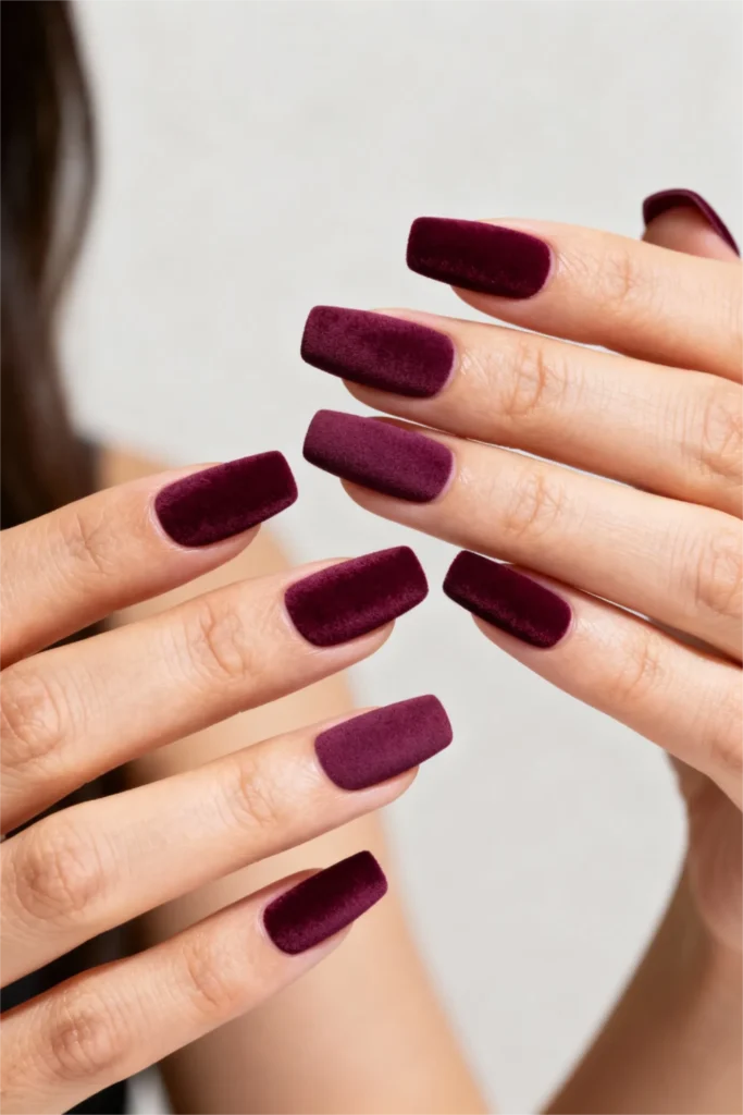 Velvet nails are having a moment, and this deep plum shade is absolutely gorgeous. Velvet texture is different from regular matte—it has this fuzzy, almost suede-like finish that you can actually feel when you run your finger over it. It’s tactile and unique, definitely not something you see every day. The color itself is a rich, wine-toned plum that feels luxurious and moody.