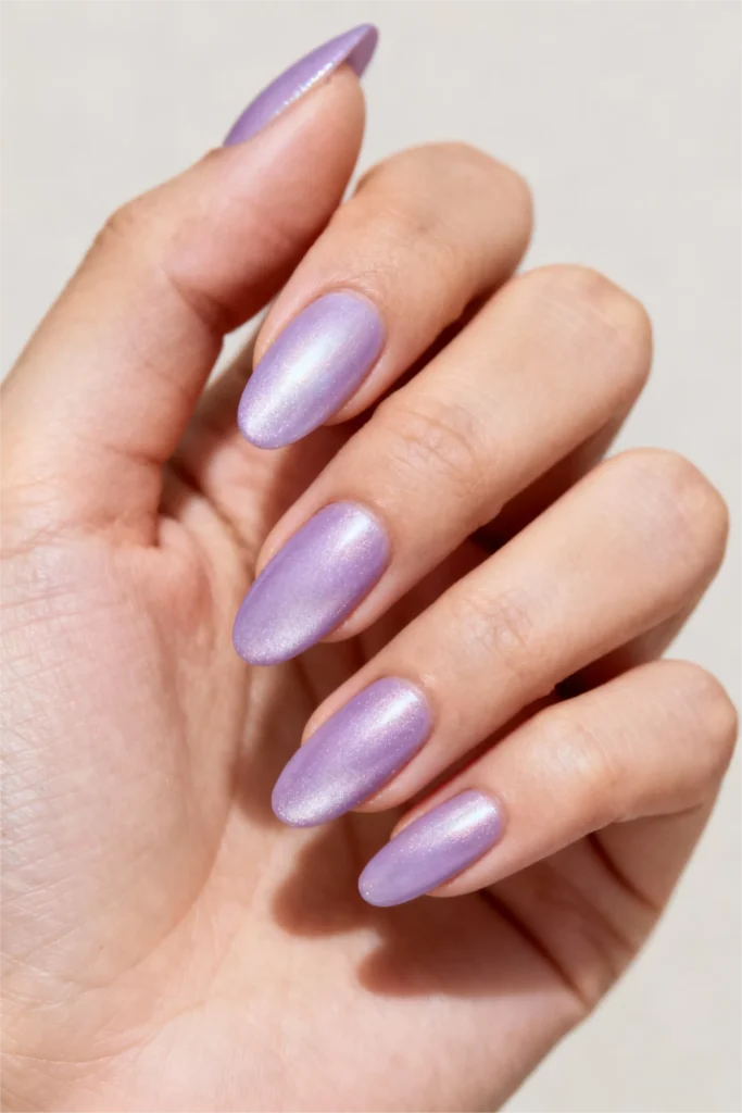 Lavender is back and it’s bringing all the dreamy, soft-girl energy with it. But this isn’t your basic pastel purple—there’s a gorgeous shimmer running through it that gives the color dimension and movement. The almond shape adds just a hint of femininity without going full-on pointed. It’s that perfect nail shape that feels grown-up but still playful.