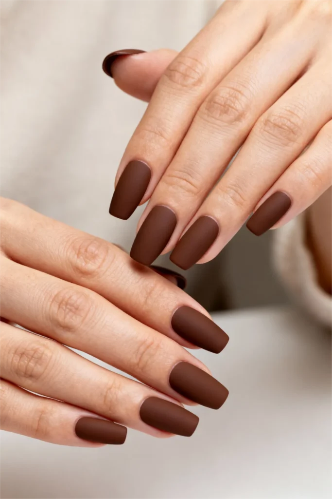 Matte finishes are everywhere in 2026, and this chocolate brown is proof of why. There’s something so modern and confident about a matte nail—it doesn’t need shine to stand out. This particular shade is warm and earthy, almost like expensive leather or a really good latte. It’s neutral enough to go with everything but interesting enough that it doesn’t feel boring.