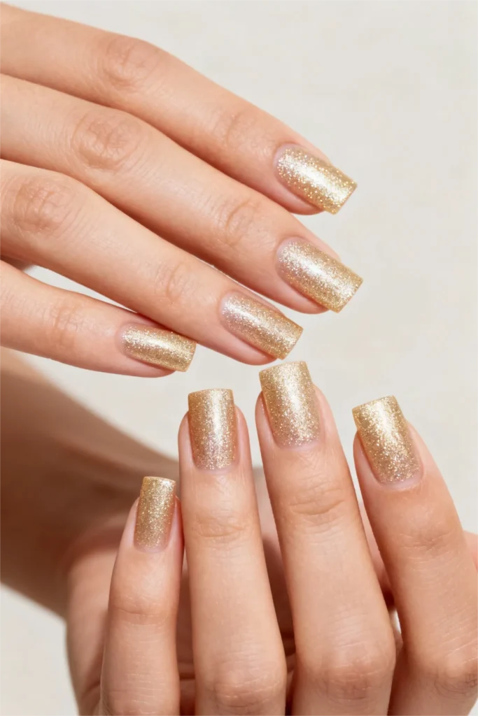 Sometimes you just want to sparkle, and this gold glitter gradient delivers exactly that. The base is a soft, almost peachy nude that transitions into concentrated gold glitter toward the tips. It’s glamorous without being over-the-top, celebratory without screaming “special occasion only.” The gradient effect means the glitter feels integrated rather than just slapped on top.