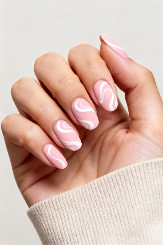 This design works particularly well in spring and summer, but honestly, it’s cute year-round. The pink is soft enough to feel neutral, and the white adds brightness and contrast. If you’re someone who loves the idea of nail art but doesn’t want anything too structured or precise, these freeform swirls are perfect. They’re artsy without being pretentious, fun without being juvenile. It’s that sweet spot of interesting but wearable.