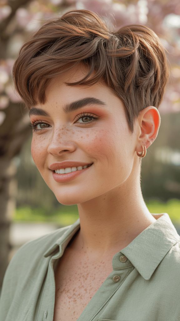 There’s a sweetness to this look that hits differently. Rich chocolate-brown layers, slightly tousled, with a wispy fringe that just grazes the brows. Cherry blossoms blur in the background, freckles dust the nose and cheeks, and the sage-green button-up shirt completes a palette that feels pulled from a spring watercolor. This modern spring pixie 2026 is proof that sometimes the most beautiful choice is the simplest one. No dramatic color, no extreme shape — just a perfectly executed cut that lets your natural beauty take center stage.