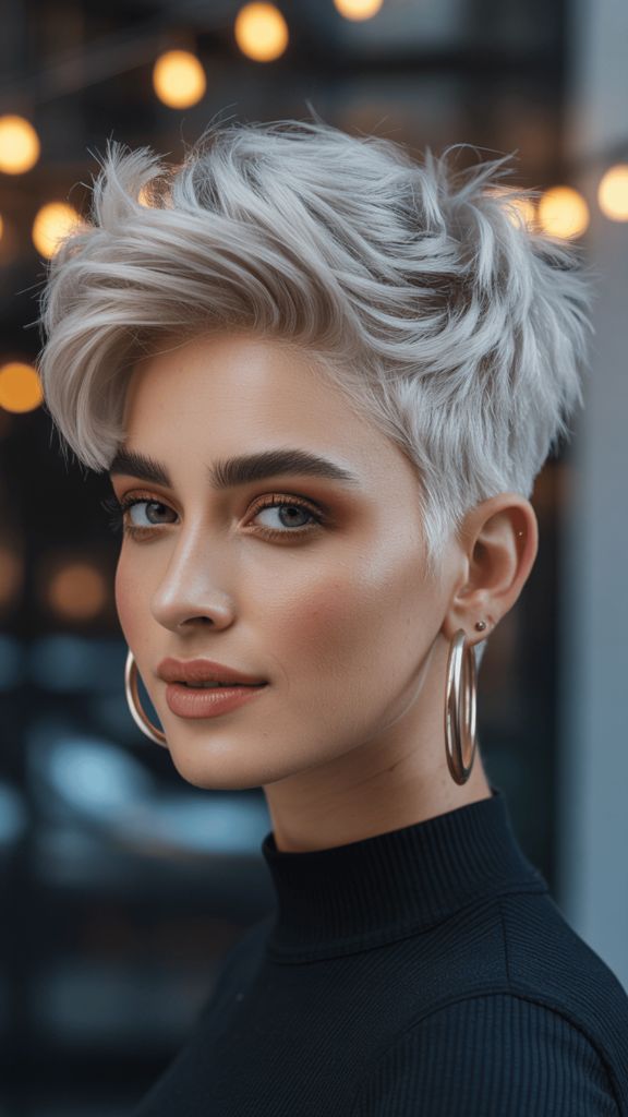 Platinum blonde swept dramatically to one side, with a fade that disappears into the skin behind the ears — this cut is razor-sharp in every sense. The silver-white color catches city lights like metal, and the black turtleneck and oversized hoops give it an editorial, almost futuristic quality. Among bold spring pixie trends, this one stands alone. It’s not asking for attention; it’s commanding it. The texture on top is deliberately tousled, preventing the platinum from reading too severe.