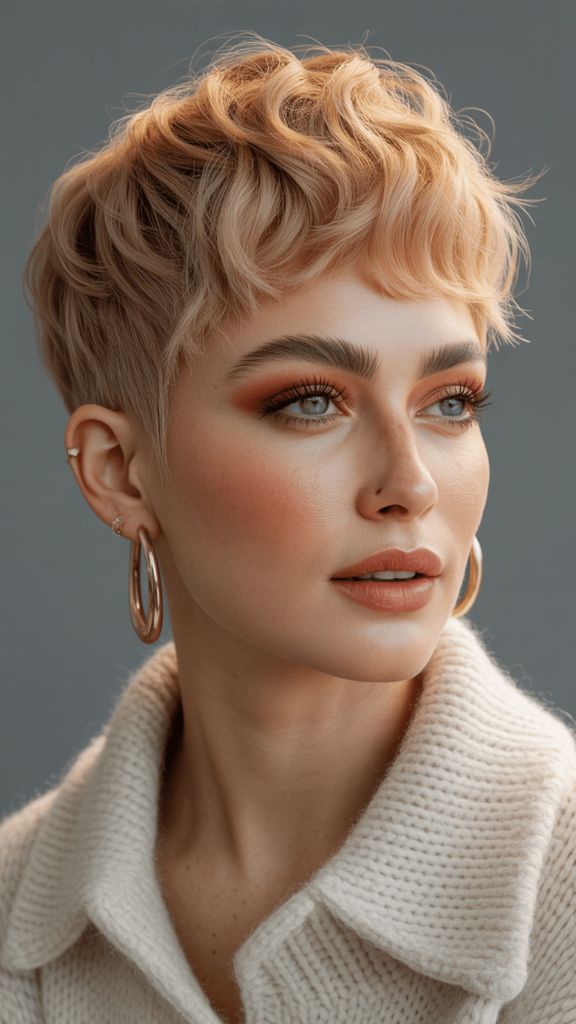 Peach meets blonde in this impossibly soft, wavy pixie that feels like the color equivalent of a spring sunrise. The warm golden hue transitions into the faintest peach at the tips, and the short, tapered sides keep everything structured. Gold hoop earrings and a cream waffle-knit collar frame the face with cozy elegance. This spring pixie hair color idea is for the person who wants something creative without going full fantasy — it whispers rather than shouts, and that subtlety is what makes it so captivating.