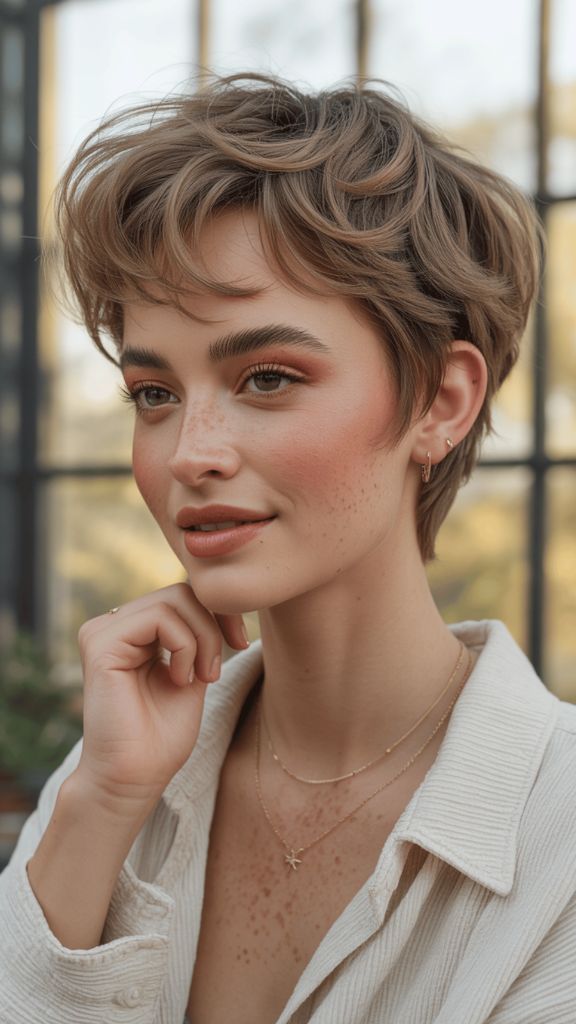 Warmth radiates from this look — from the sun-kissed light-brown waves to the freckled décolletage to the cream linen shirt. This is the modern spring pixie 2026 at its most approachable. The cut features longer layers on top with soft, piecey texture that moves naturally, while the sides are kept short enough to show off small stud earrings. It’s the kind of hair that looks like it was styled by a gentle breeze, and that effortlessness is its greatest asset.