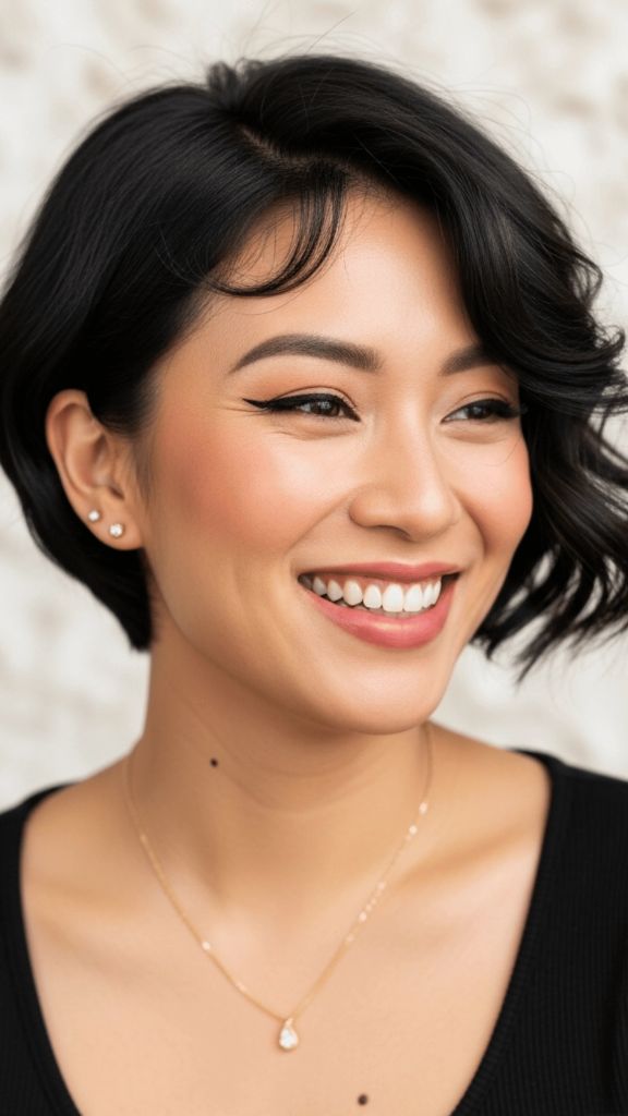 Joy — that’s the first word that comes to mind. This chin-length pixie-adjacent bob radiates warmth, with jet-black waves flipping outward and a side-swept fringe that catches mid-laugh. It’s the kind of hairstyle that moves when you move, and for spring, that sense of lightness is everything. The short pixie haircuts 2026 conversation isn’t just about going ultra-cropped; it’s about finding the length that lets your personality breathe. This look does exactly that, blurring the line between a grown-out pixie and a structured mini bob.