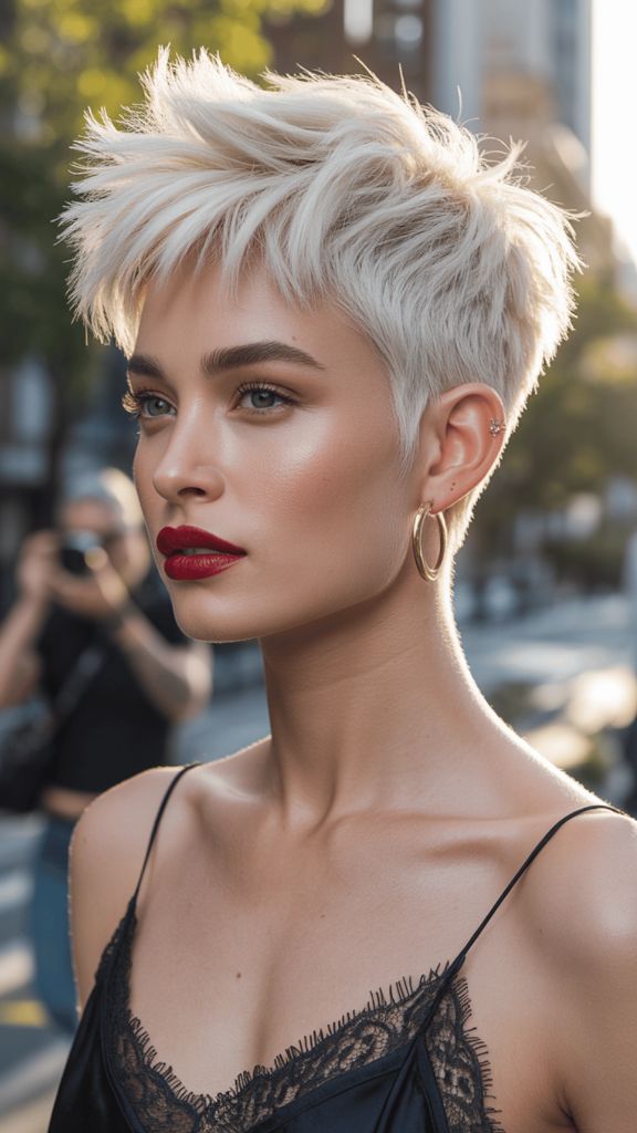 Edgy, sharp, and absolutely electric — this platinum spiky pixie is pure fashion-week energy. The hair stands up in textured, feathered spikes, white-blonde catching every photon of light, while a bold red lip adds the only color needed. The black lace camisole and gold hoops place this firmly in evening territory, and the paparazzi-blurred background only adds to the editorial fantasy. This bold spring pixie trend is not for the faint of heart. It’s for the person who wants their hair to match their ambition.