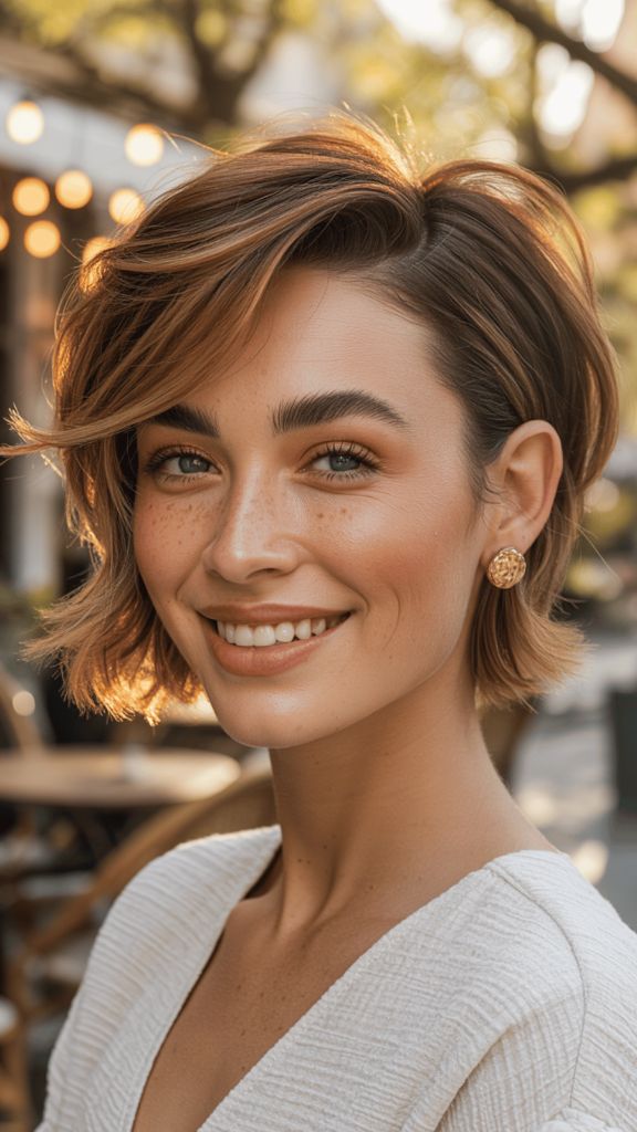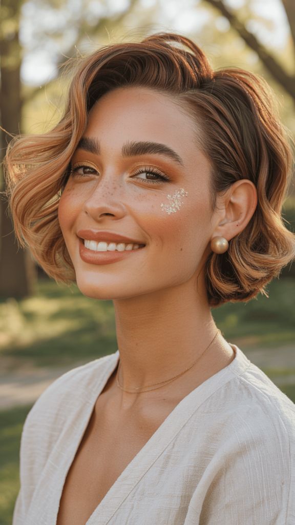 Sun-drenched caramel waves, a deep side part, and the kind of smile that makes you believe in spring — this grown-out pixie sits at that perfect length where it’s neither fully a pixie nor fully a bob, and that ambiguity is part of its charm. The warm brown tones catch sunlight like honey, and glitter scattered across the cheekbones adds a festival-ready whimsy. Pearl button earrings and a linen V-neck complete the effortless spring narrative.