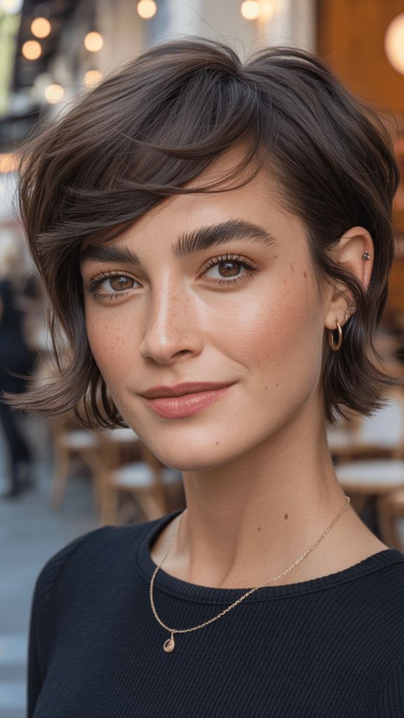 Effortless is overused, but nothing else quite captures this look. Dark brunette waves, slightly disheveled, grazing the jawline with a soft fringe that’s been finger-combed rather than styled. The café-lit background almost feels too perfect — this is the hair you imagine on someone reading Camus in a Parisian bistro. It’s a bold spring pixie trend that leans into that grown-out, “I woke up like this” aesthetic while still being clearly intentional. The small gold hoop and delicate necklace keep everything minimal.