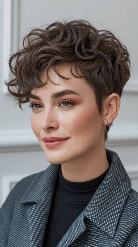 There’s a quiet power in a curly pixie that sits just right — voluminous on top, tapered on the sides, and entirely unbothered. This look captures that spring pixie haircut 2026 energy perfectly: soft brunette curls tumbling forward with just enough height to feel architectural. The gray blazer and dark turtleneck underneath ground it in sophistication. It’s the kind of cut that says you don’t need to shout to be heard. The curls do the talking, catching light and shadow in equal measure, and every wave feels intentional without being overdone.