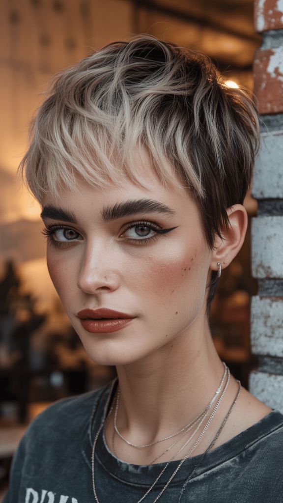 Two-tone hair on a pixie is incredibly striking, and this look nails it. Bleached blonde on top melting into dark brunette underneath, with choppy layers that create movement and depth. The dramatic cat-eye liner and terracotta lips give it a rock-and-roll edge, while the layered silver necklaces and brick wall backdrop complete the urban aesthetic. This bold spring pixie trend is for the person who sees their hair as art — not just a style, but a canvas.