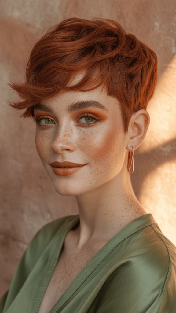 Copper is having its renaissance this spring, and this pixie wears it like a second skin. Rich, warm auburn waves sit close to the head with a slightly feathered fringe that softens the forehead. Those green eyes and scattered freckles make the whole palette feel like it was pulled from a Tuscan sunset. This is one of the most beautiful spring pixie hair color ideas I’ve encountered — it takes a familiar cut and transforms it entirely through color. The olive green blouse underneath creates a complementary contrast that feels earthy and grounded.