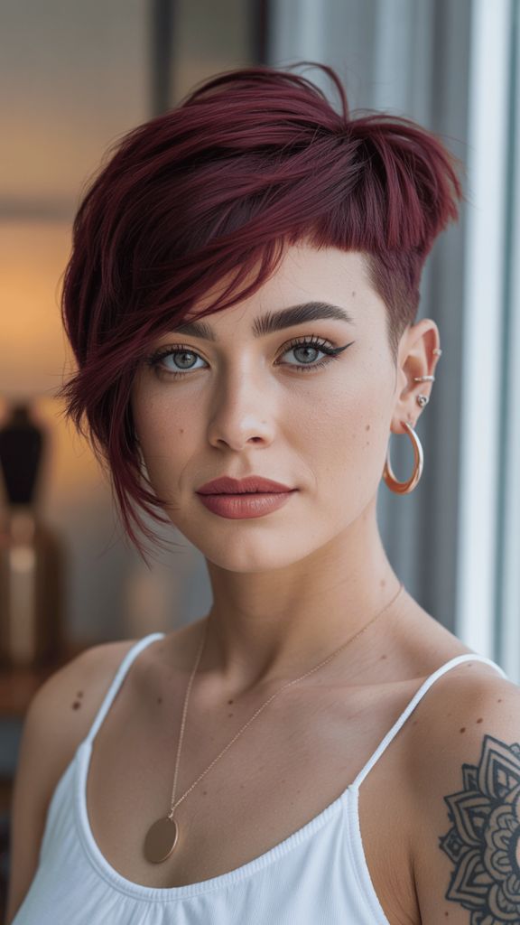 Deep, wine-dark burgundy with a long, sweeping fringe and a tight fade behind the ear — this is drama at its most sophisticated. The color sits somewhere between merlot and plum, rich enough to feel luxurious but dark enough to remain versatile. Paired with a bold cat-eye and a simple white tank, this spring pixie hair color idea balances edge with accessibility. The mandala tattoo on the shoulder and the pendant necklace add layers of personal expression that make the whole look feel autobiographical.