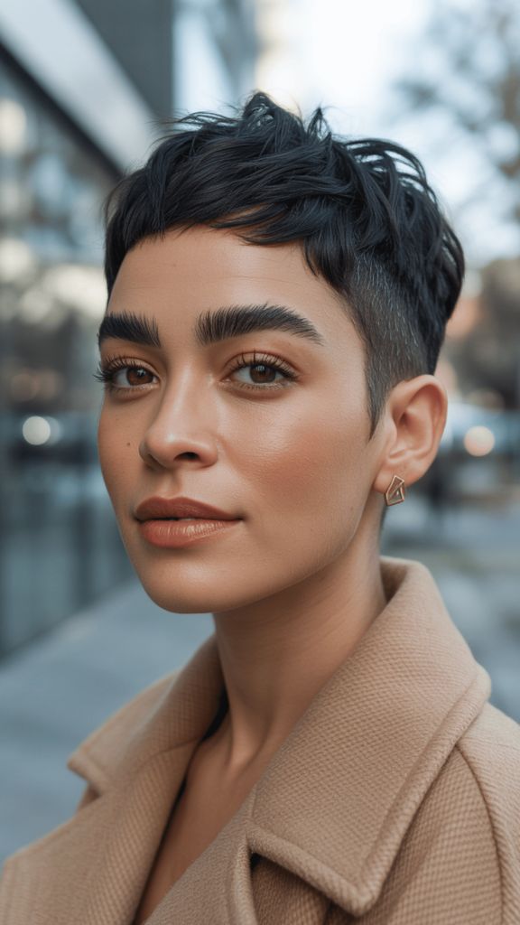 Sometimes the most powerful thing you can do is strip everything back. This jet-black micro pixie does exactly that — barely an inch of textured hair on top, faded close on the sides, with bold brows and warm nude lips taking center stage. The camel coat adds a luxe, editorial quality, and the geometric stud earring is a small but intentional detail. Among the short pixie haircuts 2026 has offered so far, this might be the most fearless. There’s nowhere to hide, and that’s entirely the point.