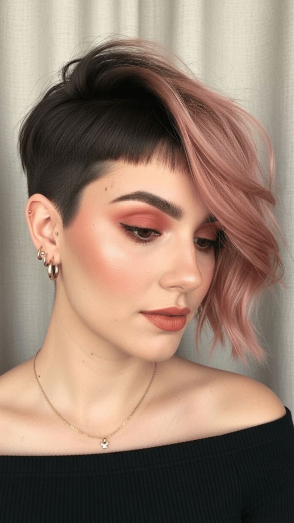 Asymmetry taken to its most artistic extreme — one side faded to the skin in dark brunette, the other cascading in a long, wavy curtain of dusty pink. The contrast is stunning, the color placement is deliberate, and the overall effect is something between punk and poetry. This spring pixie haircut 2026 pushes boundaries in the most beautiful way. The coral eyeshadow and terracotta lip tie the pink tones together, creating a cohesive color story from hairline to neckline.