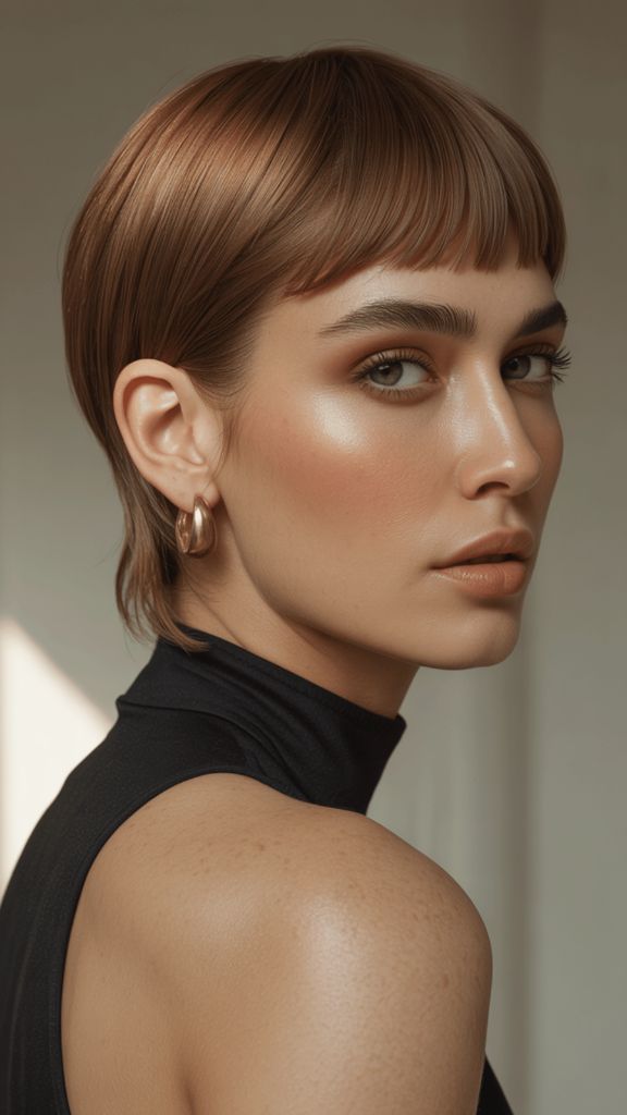 The bowl cut has been reclaimed, and this version is its most elegant iteration yet. Glossy chestnut hair falls in a smooth, rounded shape with a micro fringe that skims the brows. The gold hoop earrings and black sleeveless turtleneck give it a minimalist, high-fashion sensibility. This spring pixie haircut 2026 variation feels architectural — every line is deliberate, every angle considered. The light catches the hair’s surface like polished wood, and the result is almost sculptural.