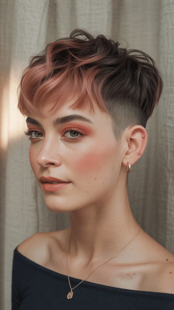 Soft pink fading into dark brunette roots, with tousled curls on top and a clean fade on the sides — this cut is a love letter to the modern spring pixie 2026 aesthetic. It’s rebellious and romantic in equal measure. The coral eyeshadow and matching blush create a monochromatic moment that ties the whole look together, and the small gold hoop earring adds just enough polish. This is the kind of cut that makes strangers compliment you at the grocery store.