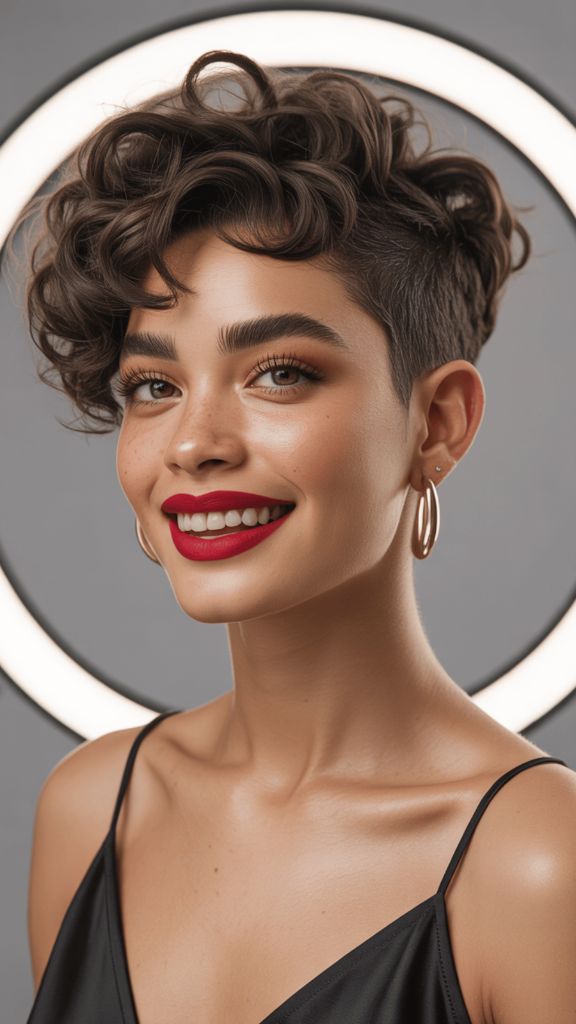 Now this is a statement. Tight curls piled high on top, a sharp fade on the sides, and a crimson lip that refuses to be ignored — this modern spring pixie 2026 look is for the woman who walks into a room and owns it immediately. The ring light halo in the background almost feels symbolic, because this cut genuinely glows. The contrast between the soft, romantic curls and the razor-clean undercut creates visual tension that’s incredibly compelling. It’s edgy and feminine simultaneously, and that duality is what makes it so magnetic.