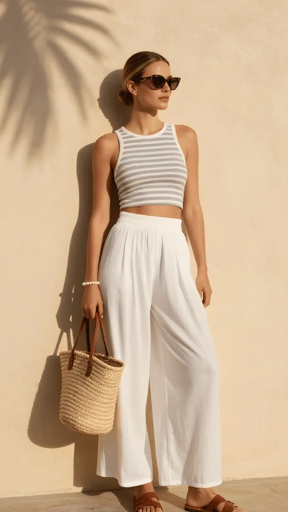 Warm weather destinations demand clothing that breathes, moves, and looks effortlessly chic even when temperatures climb. This light coastal simplicity Greece Turkey warm destinations outfit delivers on every count with a gray and white striped cropped tank top paired with flowing white high-waisted wide-leg pants. The silhouette is both flattering and forgiving, with the crop top adding a touch of modernity while the high waist keeps everything feeling polished and put-together.