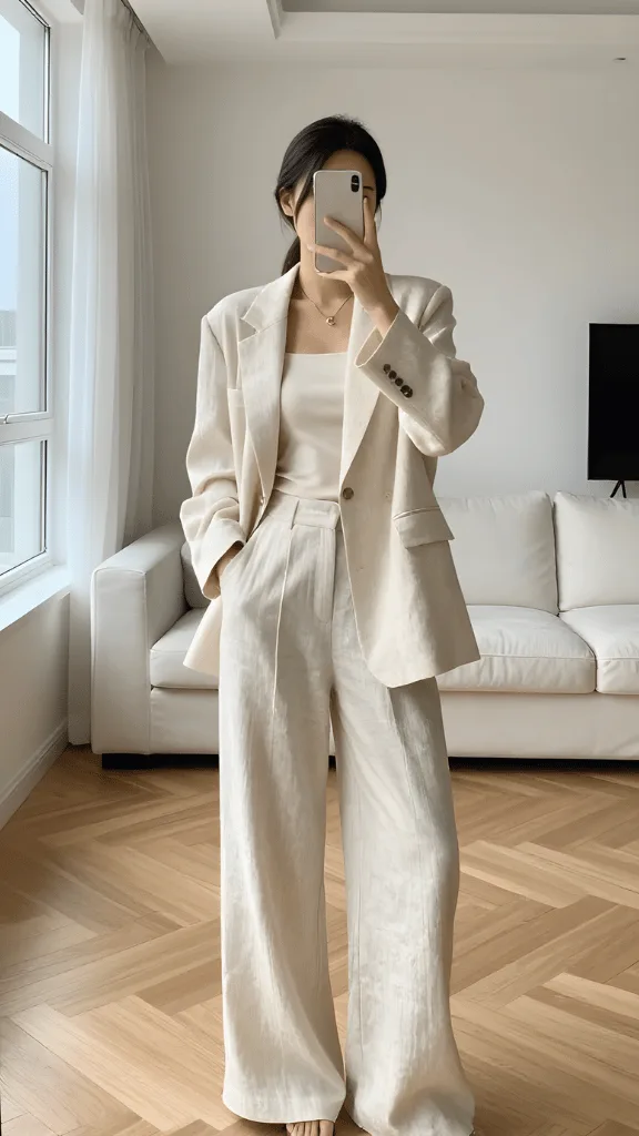 The art of traveling well includes arriving at your destination looking as composed as when you left. This monochrome knit luxury long flights European airports ensemble achieves that rare balance of comfort and sophistication that makes trans-Atlantic journeys feel less like ordeals and more like adventures. A cream linen blazer worn over a matching camisole and high-waisted wide-leg trousers creates a coordinated look that reads as intentional and polished, even after hours in the air.