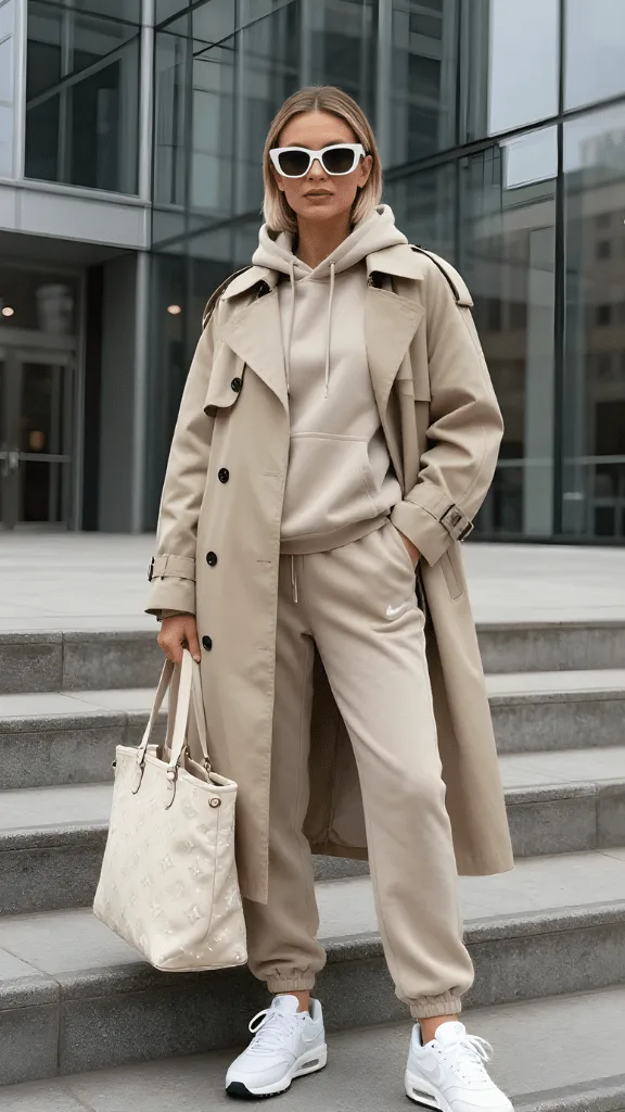 Spring in Europe can be unpredictable, with mornings that require bundling up and afternoons that invite you to shed layers and bask in the sunshine. This layered street style cold European mornings airport comfort look handles those temperature swings beautifully with a classic beige trench coat worn over a matching hoodie and joggers set. The result is athleisure elevated to something approaching luxury—comfortable enough for long flights yet polished enough for coffee stops and city exploration.
