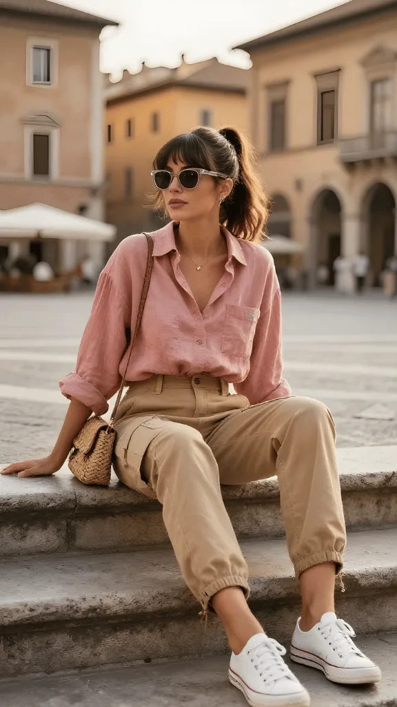 Not every travel day demands structured elegance—sometimes the itinerary calls for wandering without purpose, discovering hidden corners, and embracing the joy of getting beautifully lost. This outfit captures that spirit perfectly with a dusty rose linen button-down worn slightly oversized and casually untucked over khaki jogger-style pants. The combination is effortlessly chic in that particularly European way, looking simultaneously styled and uncontrived.