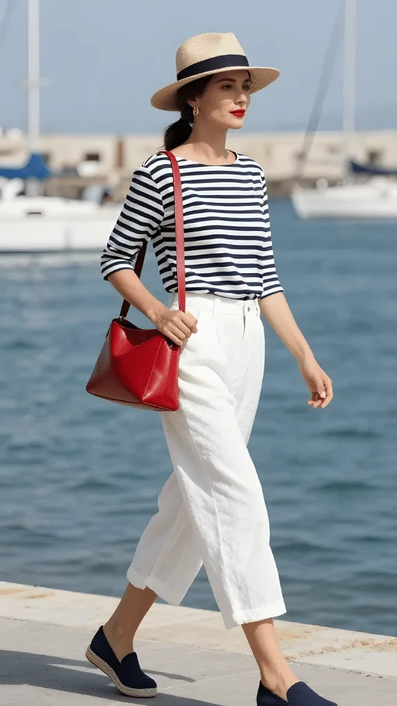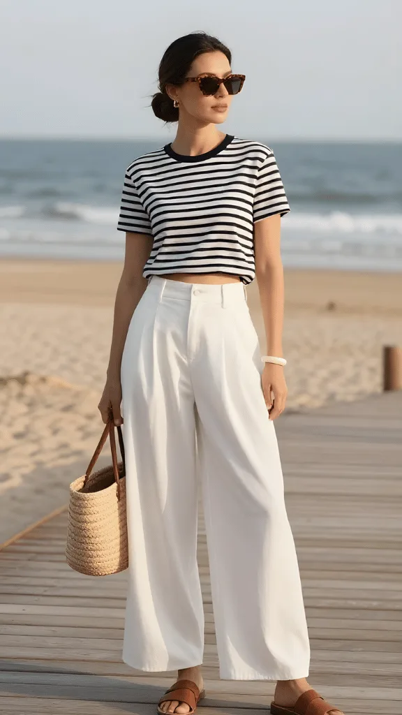 Few aesthetics have the staying power of classic nautical style, and this outfit demonstrates why the combination continues to enchant season after season. A Breton-striped boat-neck top in navy and white pairs perfectly with white wide-leg cropped trousers, creating instantly recognizable coastal European elegance. The silhouette is flattering and timeless—the kind of outfit that looks as fresh today as it would have decades ago and will continue to look decades from now.
