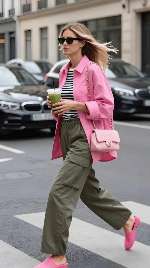 Not every travel outfit needs to whisper—sometimes the moment calls for a look that confidently announces your presence. This bold color blocking European streets spring ensemble does exactly that with a vibrant pink button-down shirt worn open over a classic black and white striped tee, paired with olive cargo pants. The color combination is unexpected but harmonious, bringing together playful femininity and utilitarian edge in a way that feels distinctly modern.