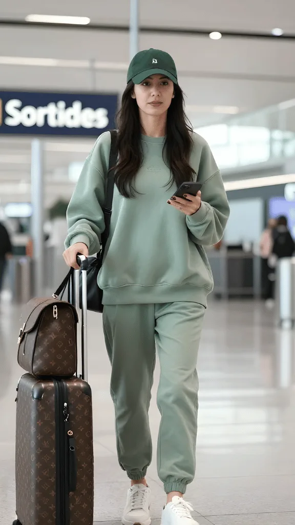 There’s a particular kind of effortless that travelers who log serious miles eventually perfect—the ability to look pulled-together while actually being extremely comfortable. This sporty neutral travel comfort airport fashion city exploration outfit embodies that skill with a sage green matching sweatshirt and joggers set that manages to feel both relaxed and intentional. The muted green tone is sophisticated enough to avoid looking overly casual, while the coordinated nature of the set ensures the overall effect is polished.