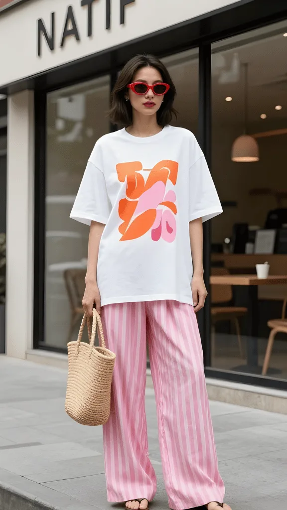 When your itinerary includes museum visits in Tokyo, gallery walks in Athens, or simply meandering through artsy neighborhoods in Barcelona, you want an outfit that feels as creative as the spaces you’re exploring. This relaxed art-inspired comfort Greece Japan warm cities look captures that essence perfectly with an oversized white tee featuring abstract orange and pink graphic elements, paired with breezy pink and white striped wide-leg pants. The silhouette is generous and forgiving, ideal for warm climates where you want airflow without sacrificing visual interest.