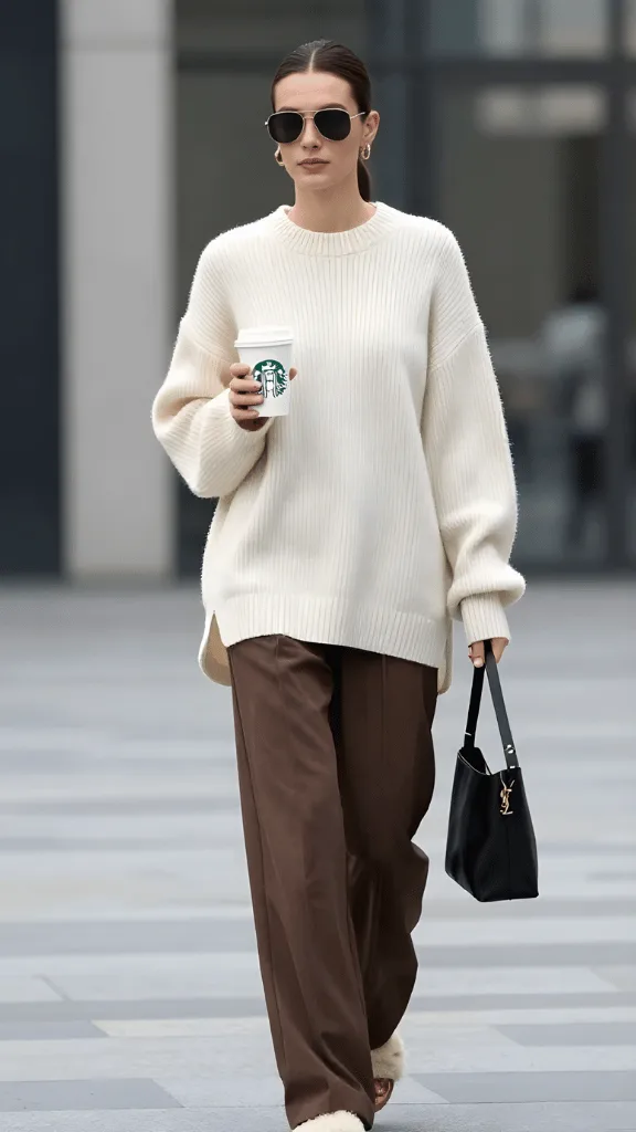 Sometimes the best travel outfits are the ones that feel like a warm hug while still looking completely intentional. This soft neutrals cozy airport fashion combination achieves exactly that with an oversized cream ribbed knit sweater paired with rich chocolate brown wide-leg trousers. The contrast between the warm cream and deep brown creates visual interest while maintaining a thoroughly cozy, approachable aesthetic perfect for early morning departures and long travel days.