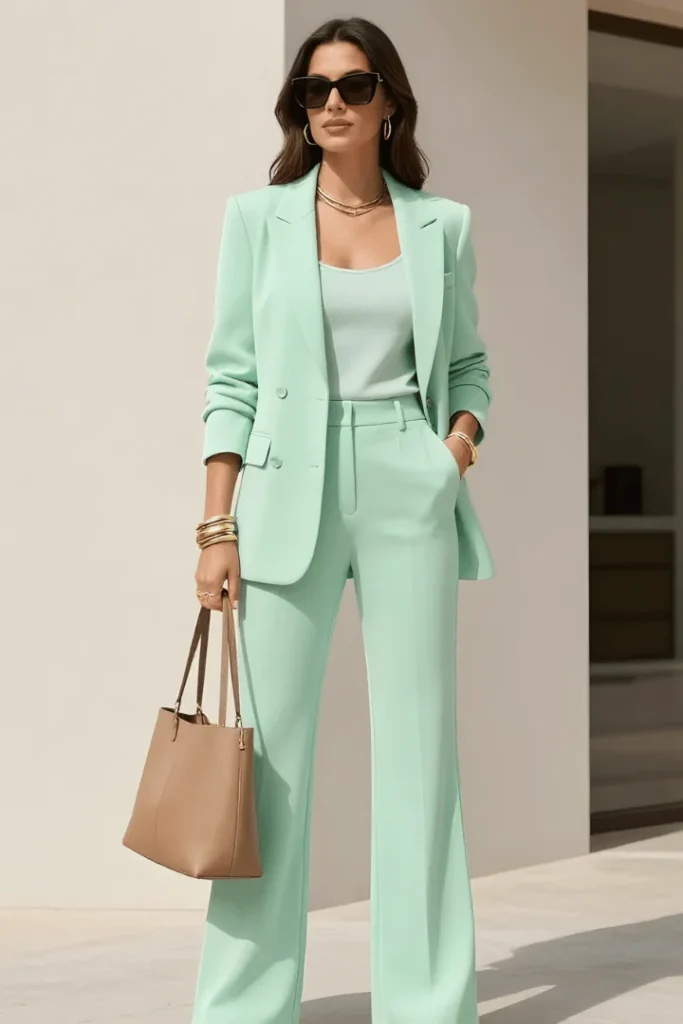 Spring color trends for 2026 embrace soft, optimistic hues, and this mint green power suit captures the mood perfectly. The beautifully tailored blazer and matching wide-leg trousers create a striking monochromatic look, while a simple white tank underneath keeps things fresh and balanced.