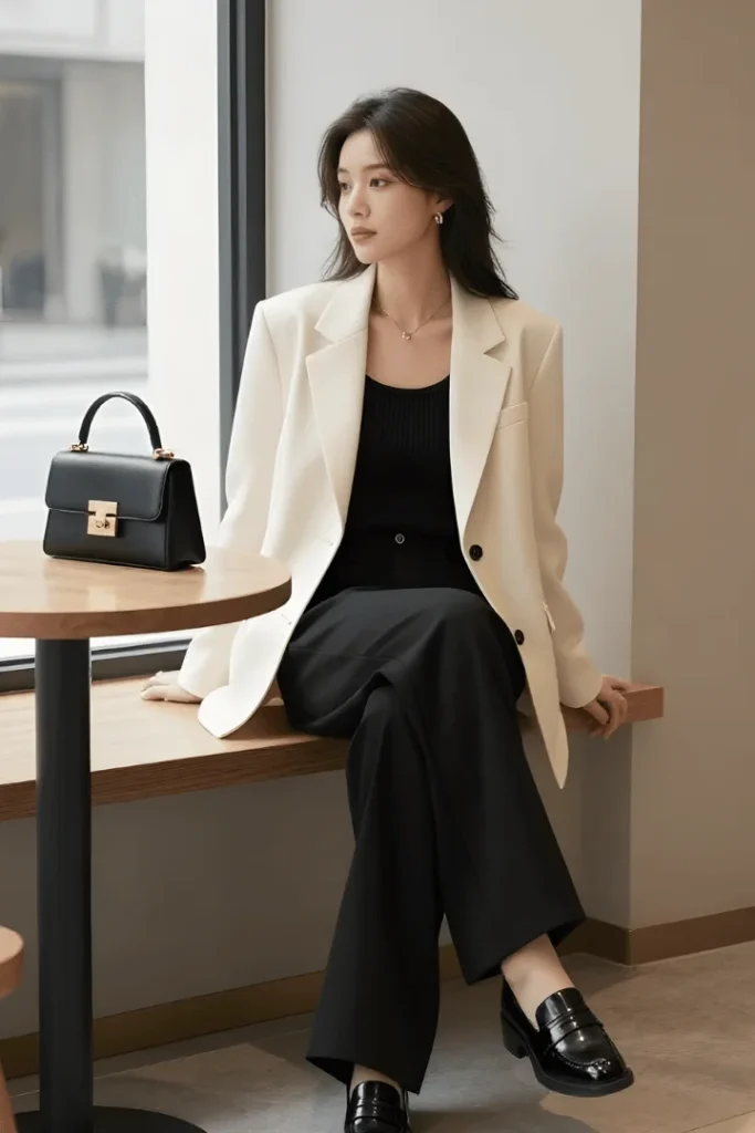 This look epitomizes spring office outfits with blazers and trousers while feeling fresh and contemporary. It’s perfect for those transitional spring days when temperatures fluctuate, offering both coverage and breathability. The neutral palette ensures endless versatility, working seamlessly with various accessories and occasions.