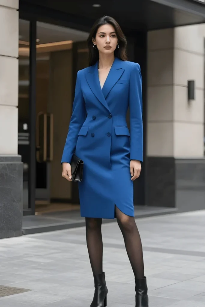 For early spring office outfits 2026 when temperatures still warrant some coverage, this cobalt blue blazer dress offers the perfect solution. The double-breasted design with structured shoulders creates a powerful silhouette, while the knee-length hem maintains workplace appropriateness.