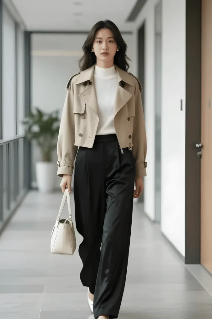 For spring office outfits for rainy days, a cropped trench-inspired jacket offers the perfect solution. This beige version pairs beautifully with a clean white ribbed mock-neck sweater and flowy black wide-leg trousers. The overall effect is polished, practical, and thoroughly modern.