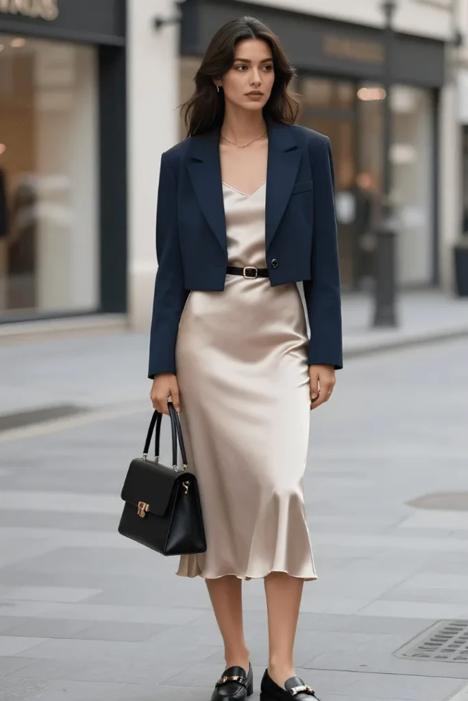 When elegance meets edge, magic happens. This outfit pairs a structured navy cropped blazer with a flowing champagne silk slip dress, creating a stunning contrast between masculine tailoring and feminine fluidity. The result is one of the most sophisticated chic light workwear ideas for women we’ve seen this season.