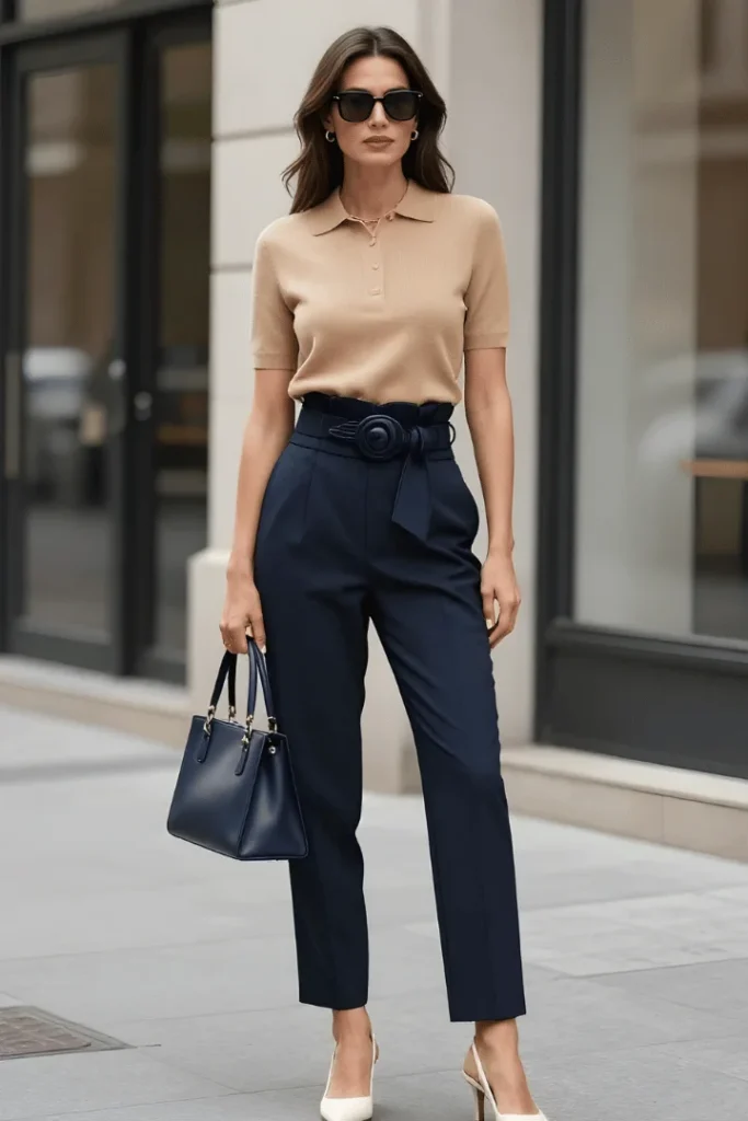 Spring office outfits 2026 for women embrace comfortable elegance, and this combination of a fitted camel knit polo with navy paper-bag waist trousers delivers exactly that. The polo shirt offers a refined alternative to traditional button-downs, with its collar adding structure while the knit fabric ensures all-day comfort.