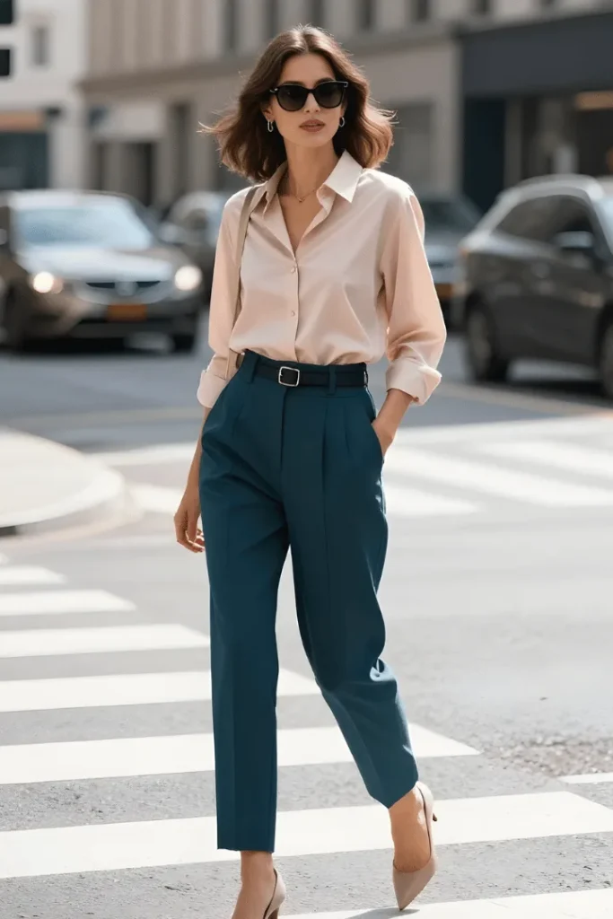 Color blocking spring office outfits 2026 don’t always need to be bold and bright. This softer approach pairs a delicate blush satin blouse with rich teal tailored trousers, creating a combination that feels sophisticated and unexpected. The colors complement each other beautifully while remaining entirely workplace-appropriate.