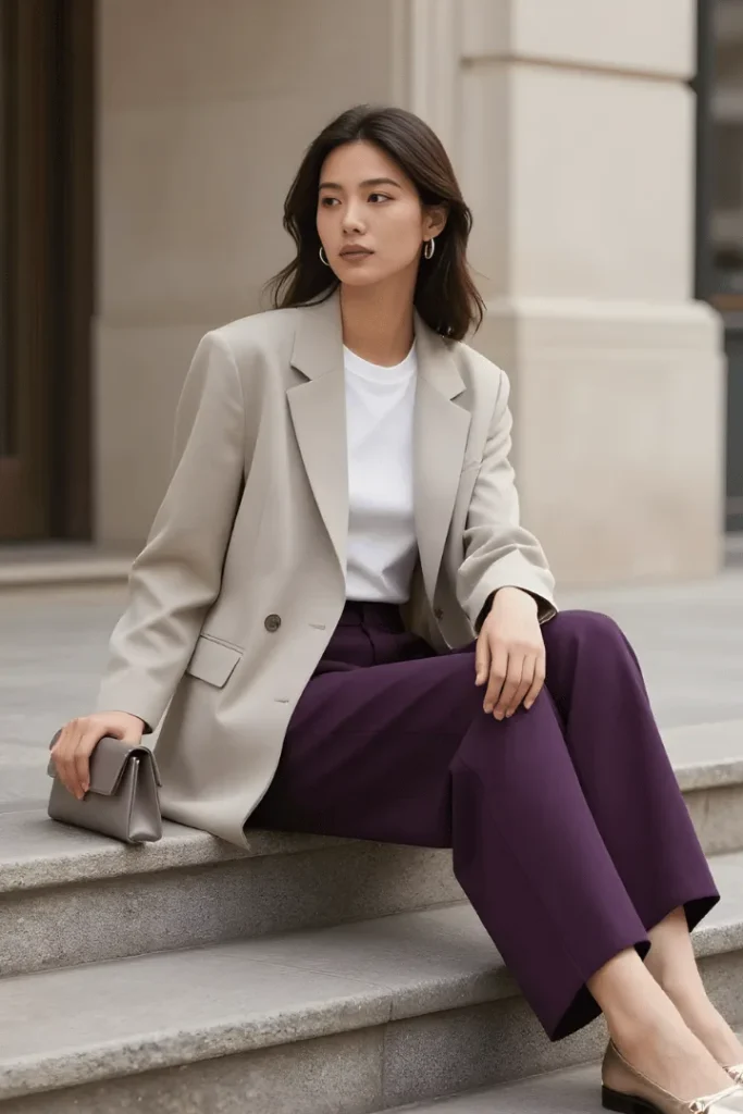 Relaxed tailoring continues to dominate women business attire work wear 2026, and this outfit showcases the trend beautifully. An oversized greige blazer drapes effortlessly over a simple white crew-neck tee, while rich plum wide-leg trousers add unexpected color below. The overall effect is modern, artistic, and thoroughly sophisticated.