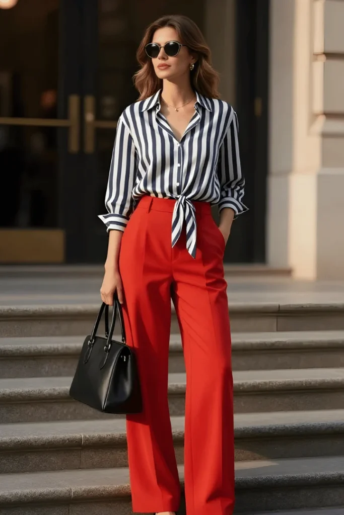When pattern meets bold color, the result is unforgettable. This outfit pairs a navy and white vertical striped blouse, knotted at the waist, with vibrant red wide-leg trousers for a look that’s confident, chic, and perfectly suited for spring. The combination feels fresh while remaining entirely appropriate for professional settings.