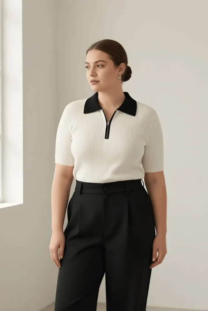 Sometimes the most powerful outfits are the simplest ones. This monochrome spring work outfit pairs a cream ribbed polo top with contrasting black collar and zip detail with high-waisted black trousers. The result is clean, sophisticated, and endlessly versatile.