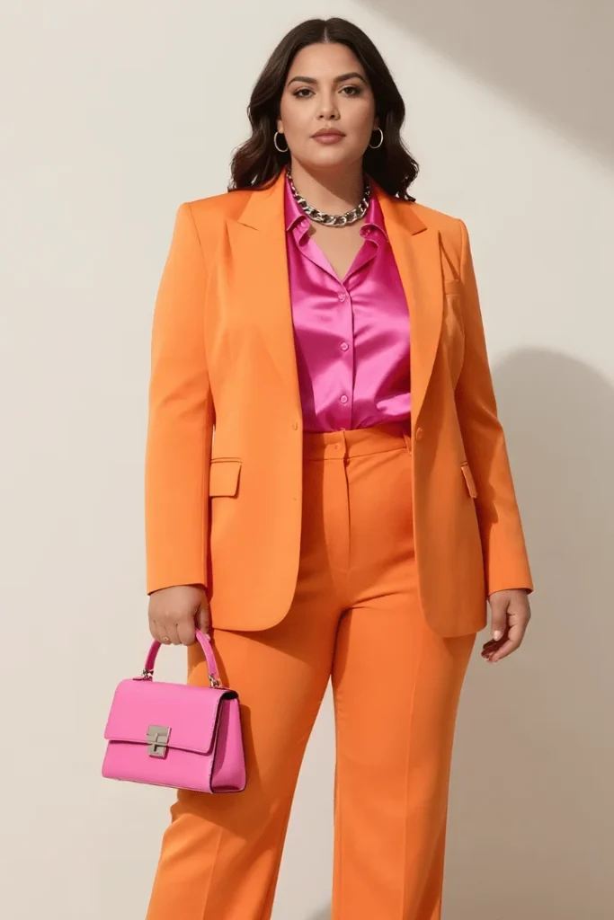 When it comes to color blocking spring office outfits 2026, this vibrant combination takes center stage. A beautifully tailored orange blazer and matching trousers create a striking monochrome base, while a hot pink satin blouse underneath adds unexpected depth and excitement. This look is for the woman who walks into meetings ready to command attention.