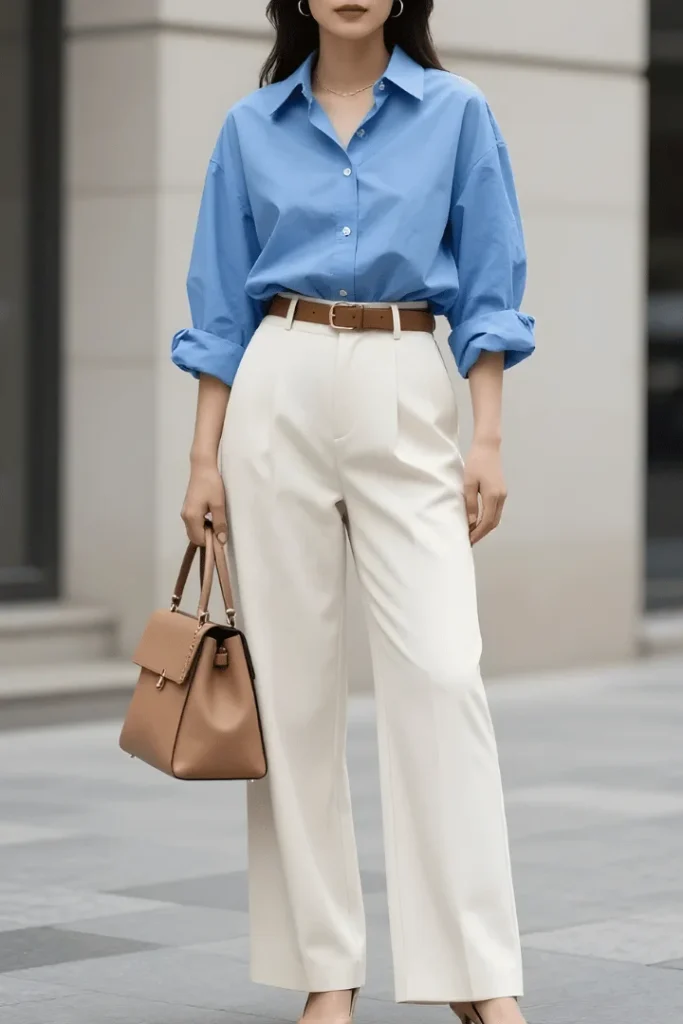 Fresh and breezy, this combination of a sky blue button-down shirt with cream wide-leg trousers captures the essence of early spring office outfits 2026. The blue shirt, casually untucked and rolled at the sleeves, brings relaxed energy to the outfit, while the structured trousers maintain professionalism.