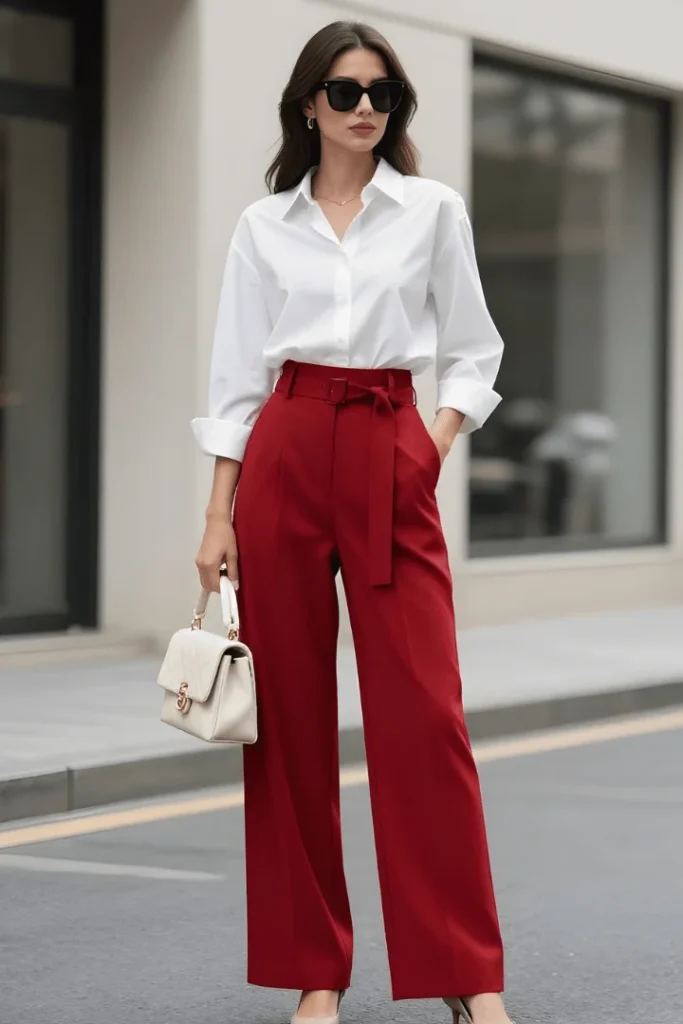 Spring work outfits with wide-leg trousers continue to dominate the professional fashion landscape, and this stunning combination shows exactly why. A crisp white button-down shirt with casually rolled sleeves pairs effortlessly with rich red wide-leg trousers that flow beautifully with every step. The paperbag waist with a fabric tie belt adds feminine detail while defining the waistline.